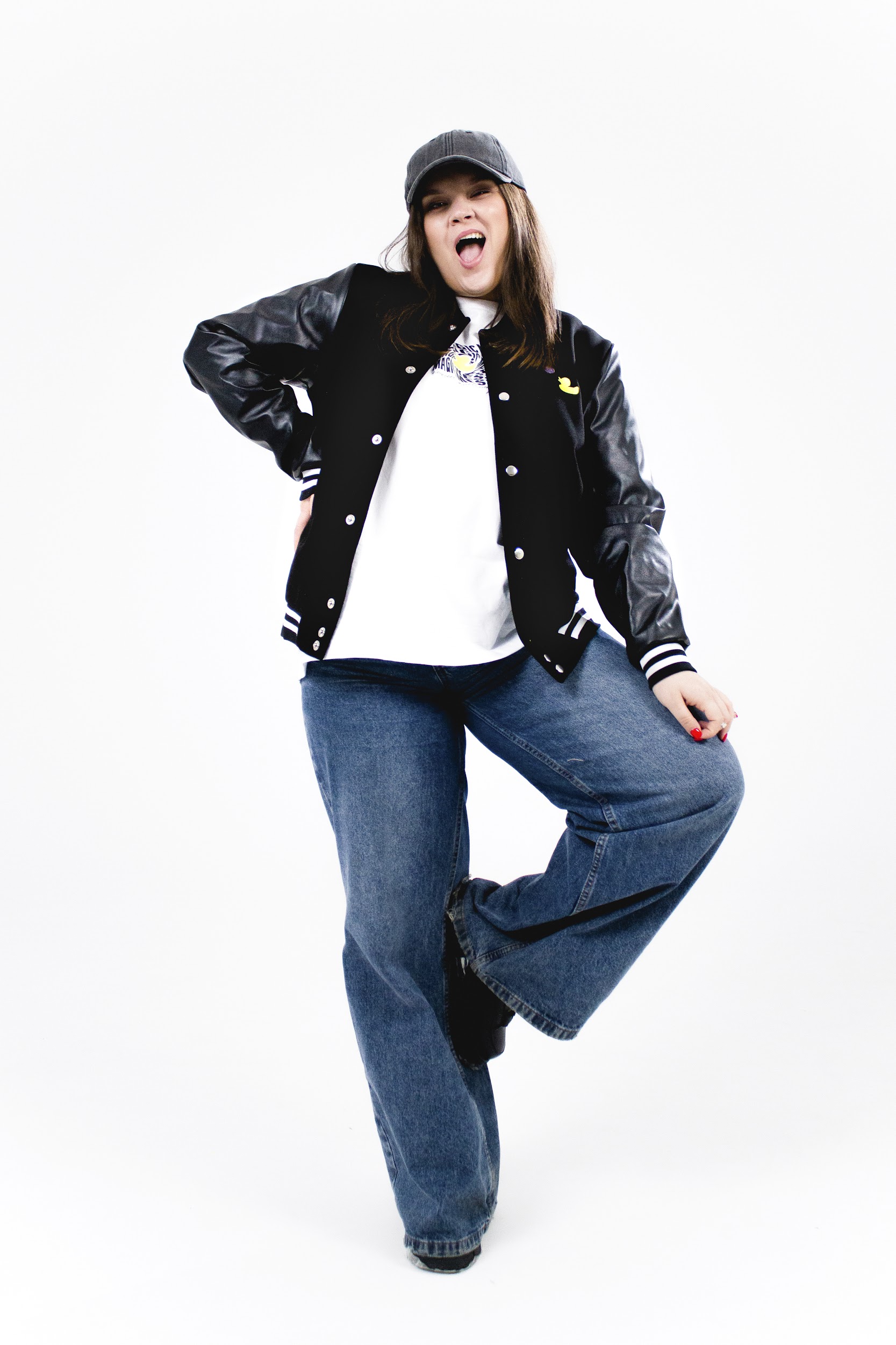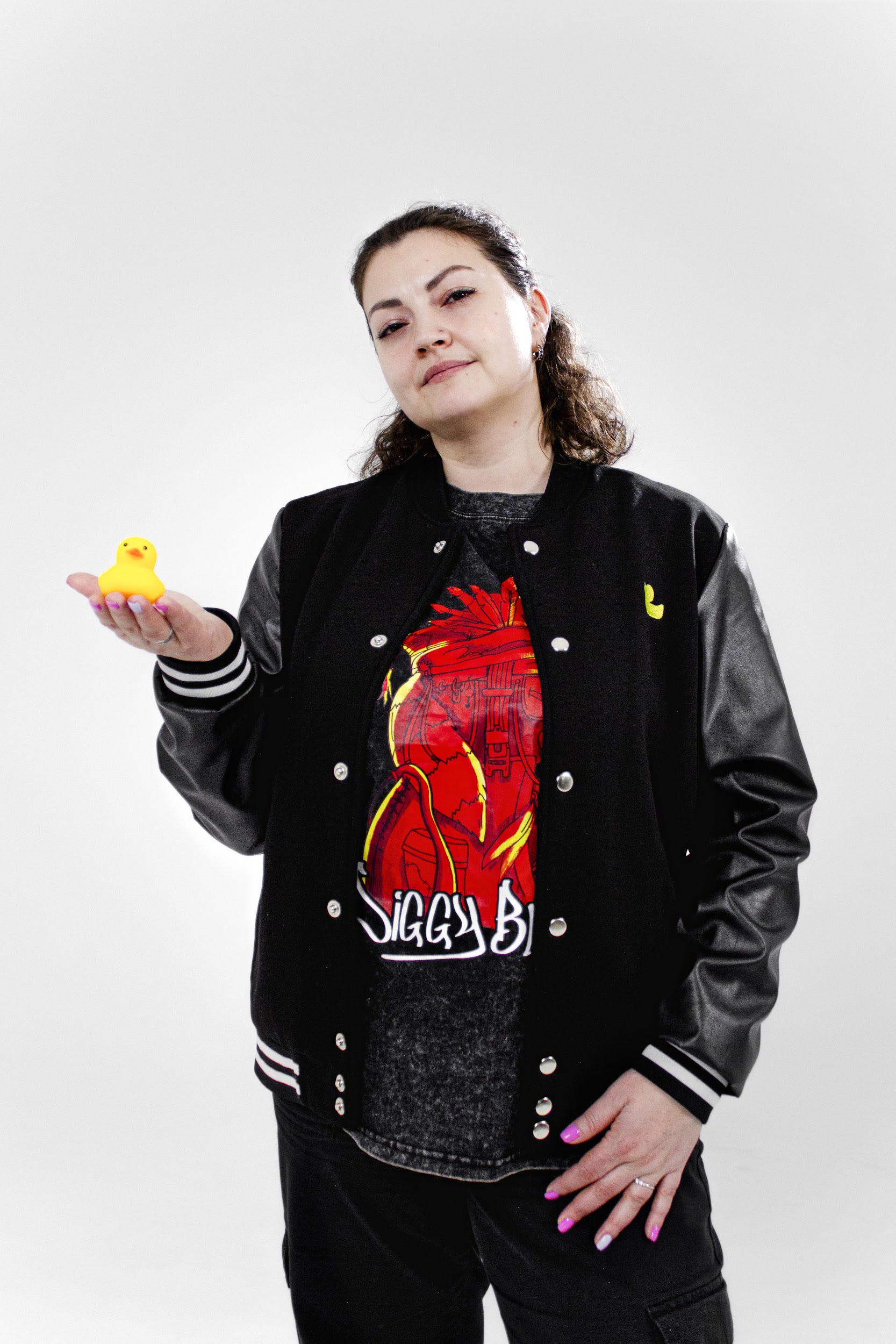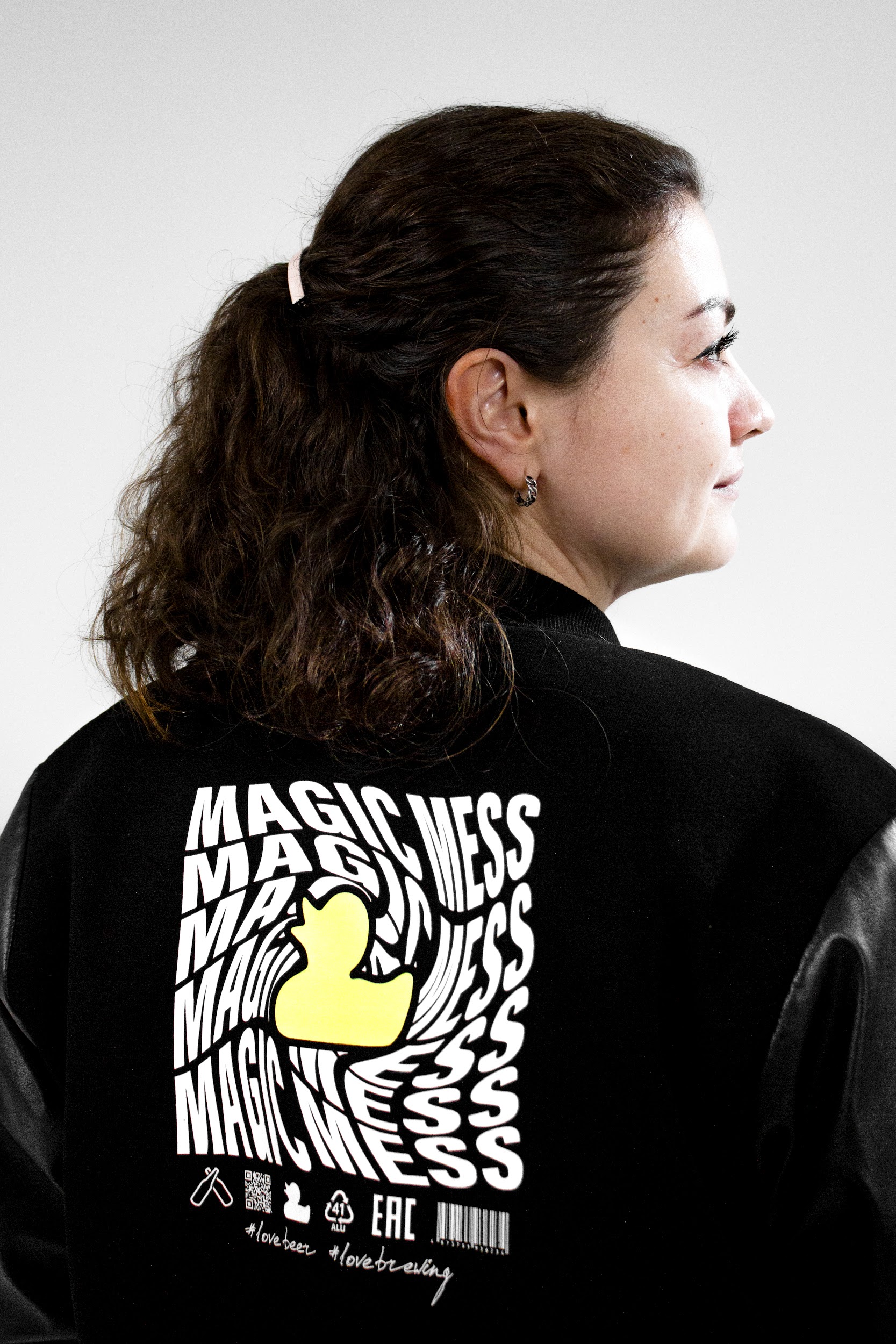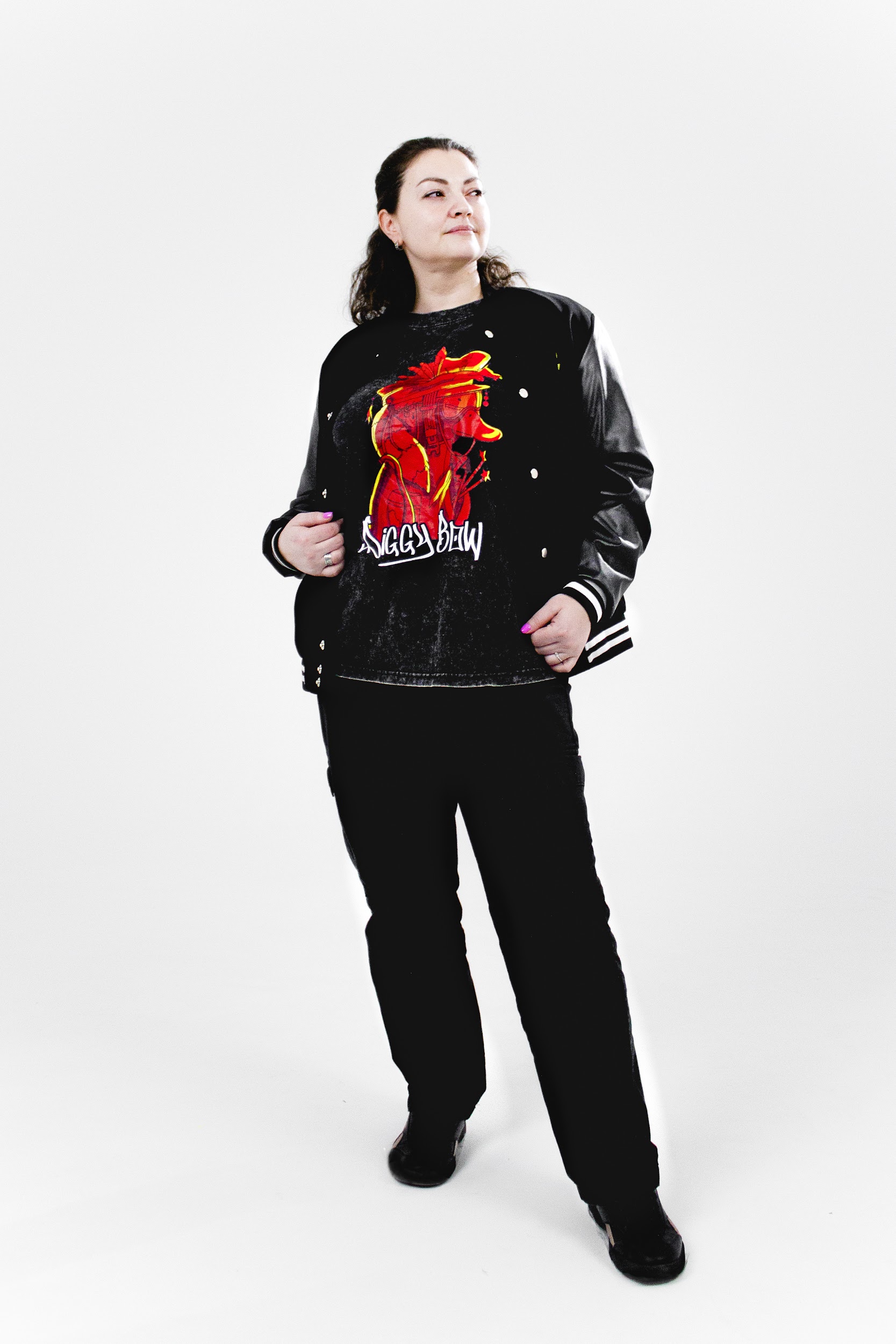 Дофига фешн бомбер из плотного футера с кожаными рукавами, утиной вышивкой на груди и принтом на спине. Размеры L, XL.