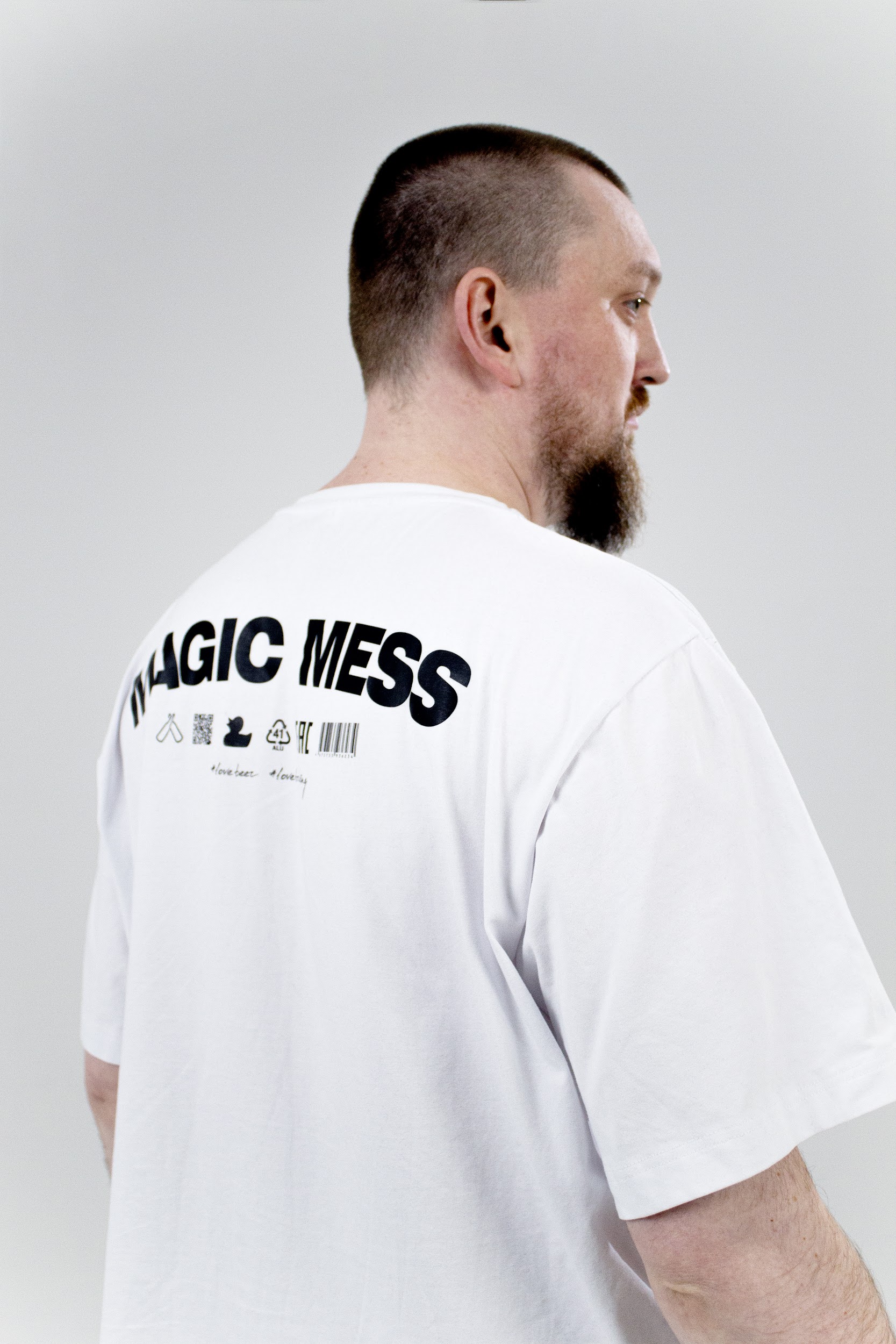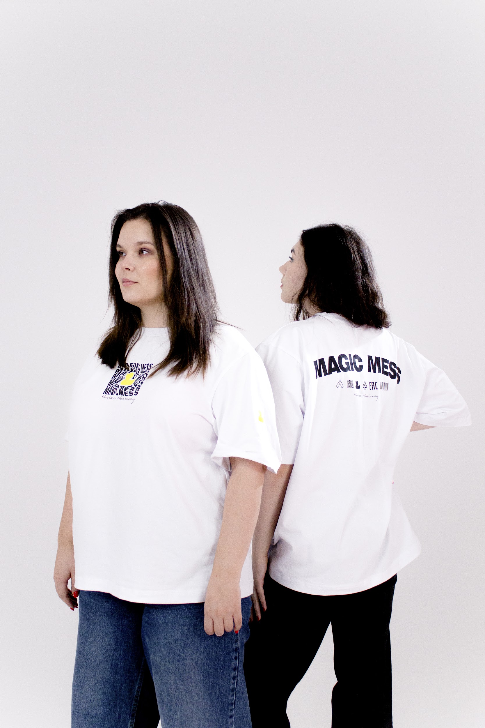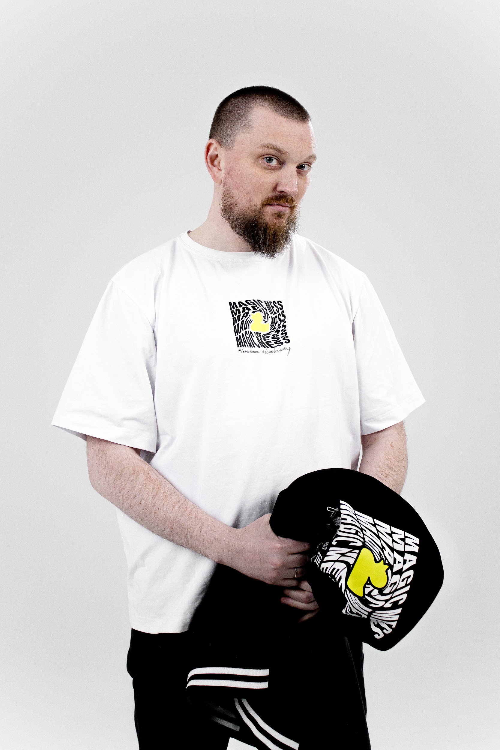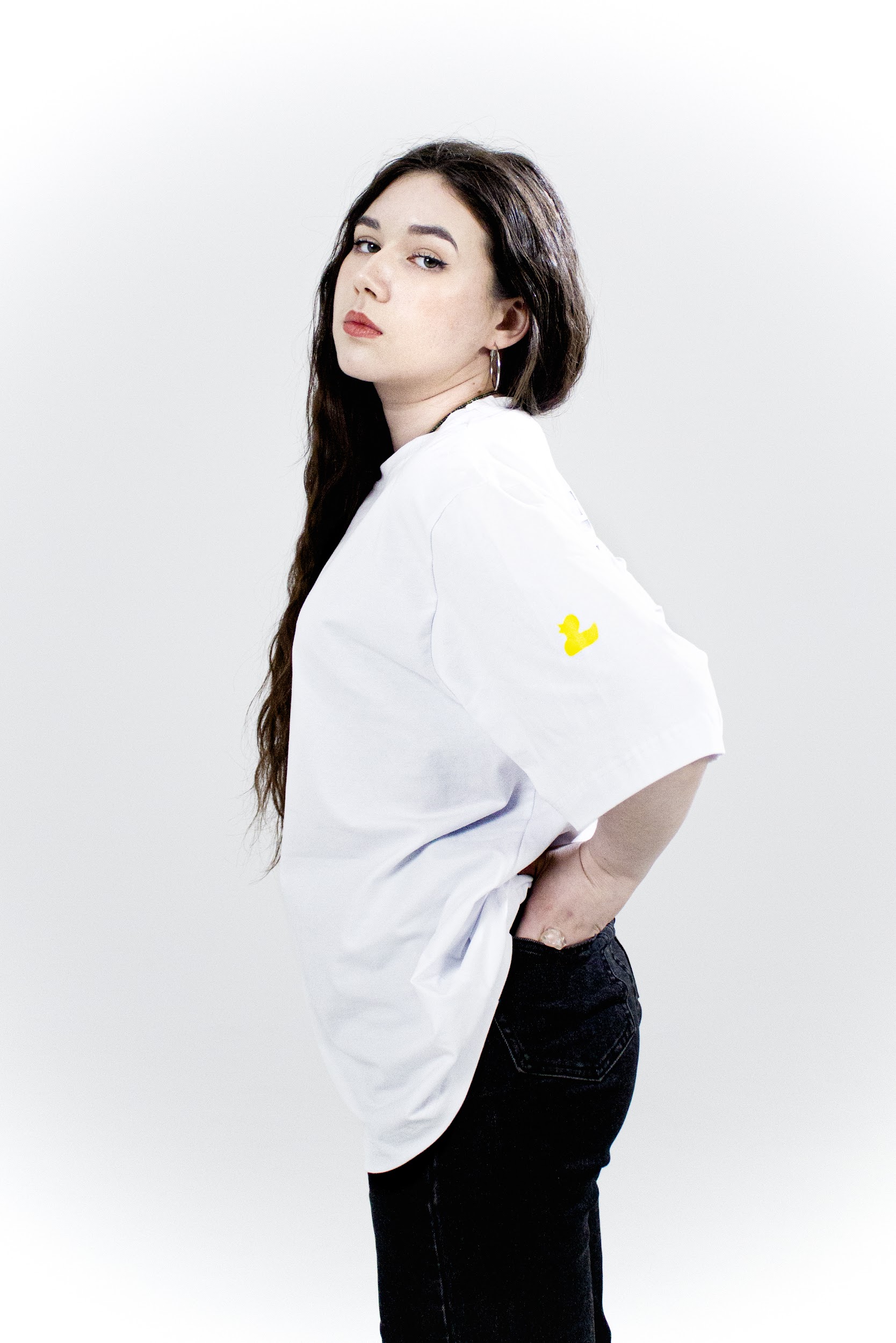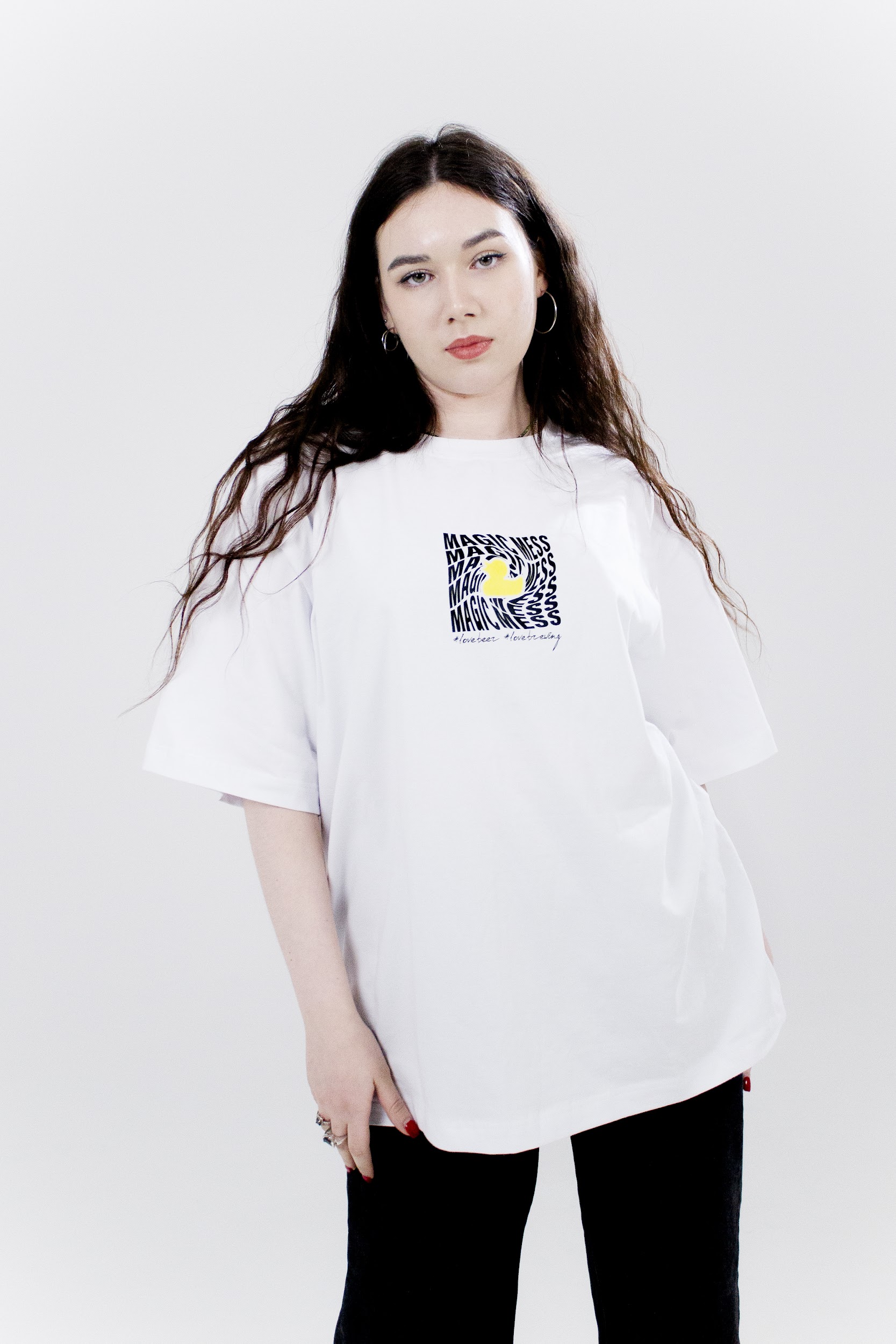 Футболка в стиле утиный минимализм: белая плотная футболка с лаконичным принтом в черно-желтых тонах. Размеры L, XL.